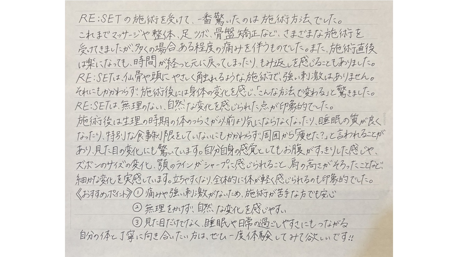 RE:SET®施術を受けていただいたお客様から、とても丁寧な感想を寄せていただきましたので紹介します😊