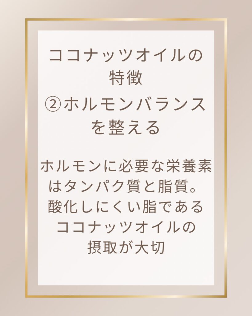 ホルモンに必要な栄養素はタンパク質と脂質。ココナッツオイルは植物性の油で”唯一”酸化しにくい油です。質の良い油はホルモンバランスを整えてくれます。私は元々身体のバランスを整えているため、生理が軽い方ですが、ココナッツオイルを日常的に摂取するようになり、さらに生理が軽くなりました。