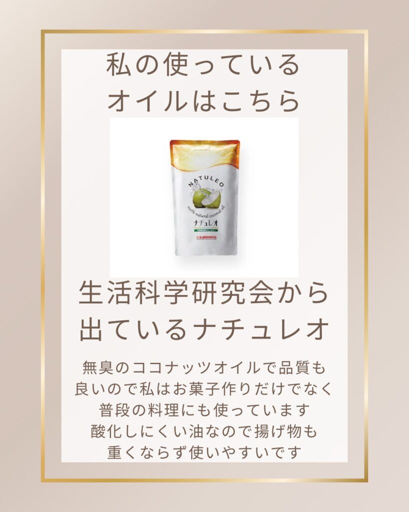 私が使用しているものは生活科学研究会から出ている”ナチュレオ”です。こちらは安心安全な品質で作られていています。厳選された天然の原料から作られ、加工過程でトランス脂肪酸が発生しないココナッツオイルです。無臭であるため、私は普段の料理で炒め物や揚げ物にも使っています。特に揚げ物は油くどさが全くなく、軽い感じなのでとても使いやすいです。胃もたれしにくく、酸化しにくい油なので揚げ物も安心して使用できます。