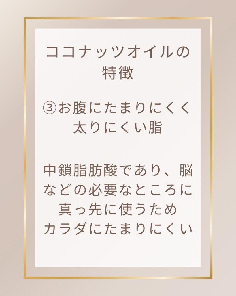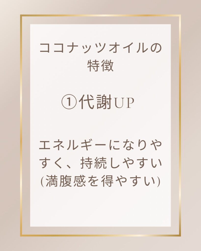 ココナッツオイルをエネルギーになりやすく、持続しやすい。少量でも満腹感を得ることができ、その満腹感が続きやすい。